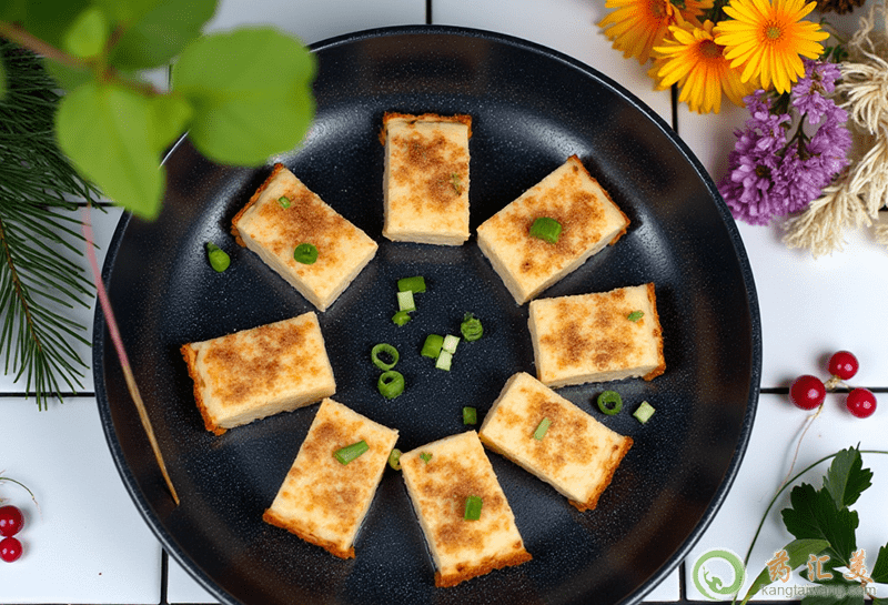 1.北豆腐切2厘米厚的薄片,熱鍋中倒入3湯勺植物油,油溫成熱時放入豆腐煎3分鐘翻面。
