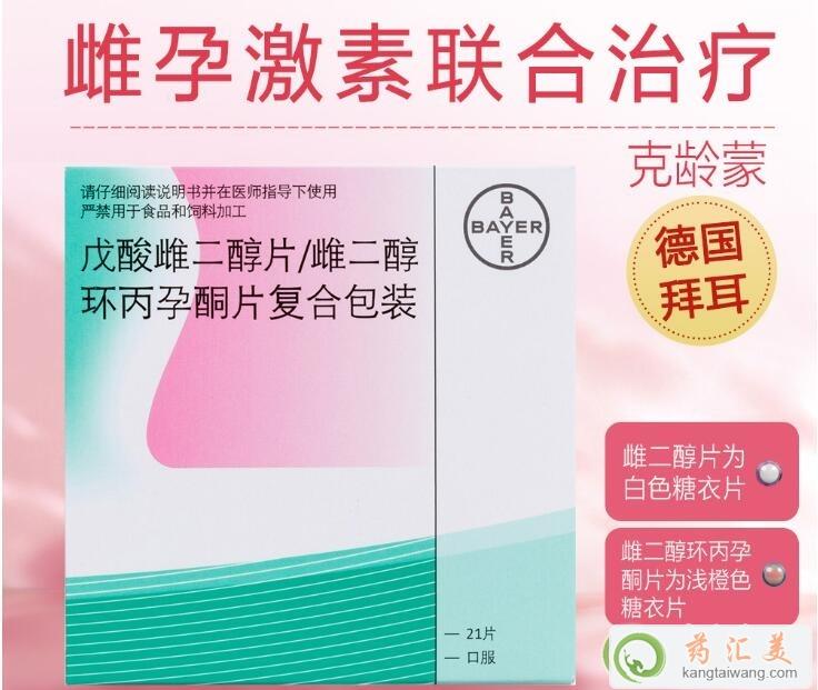 2、克齡蒙(戊酸雌二醇片雌二醇環丙孕酮片復合包裝),適應癥為本品在與孕激素聯合使用建立人工月經周期中用于補充主要與自然或人工絕經相關的雌激素缺乏:血管舒縮性疾病(潮熱),生殖泌尿道營養性疾病(外陰陰道萎縮,性交困難,尿失禁)以及精神性疾病(睡眠障礙,衰弱)。預防原發性或繼發性雌激素缺乏所造成的骨質丟失。