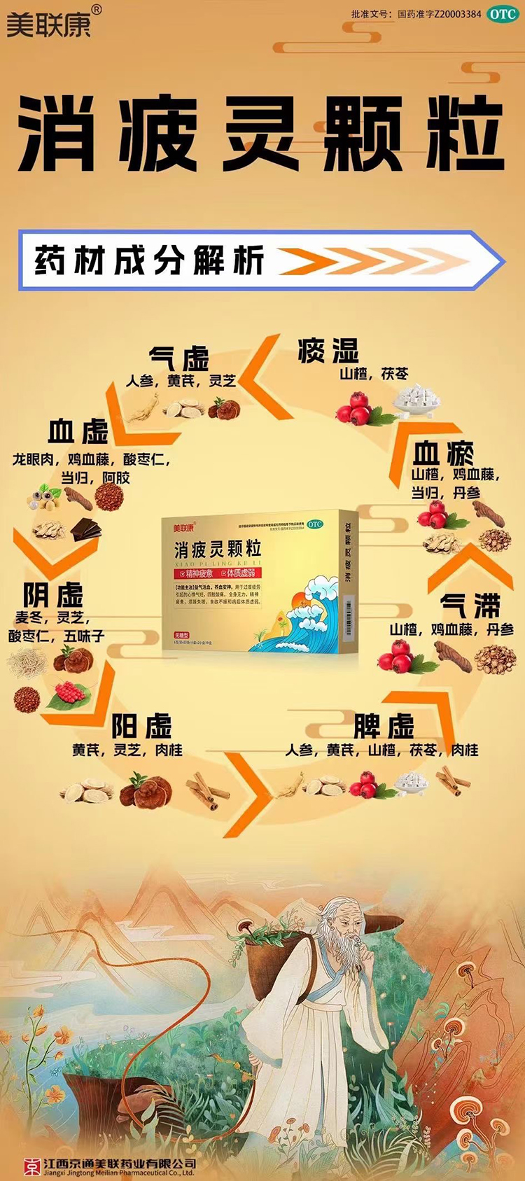 消疲靈顆粒-無糖型(美聯康)由人參、麥冬、五味子、黃芪、當歸、龍眼肉、肉桂、靈芝、雞血藤、茯苓、山楂、丹參、棗仁、阿膠14味中藥組成。益氣活血,養血安神,消除疲葷,恢復體力,用于…